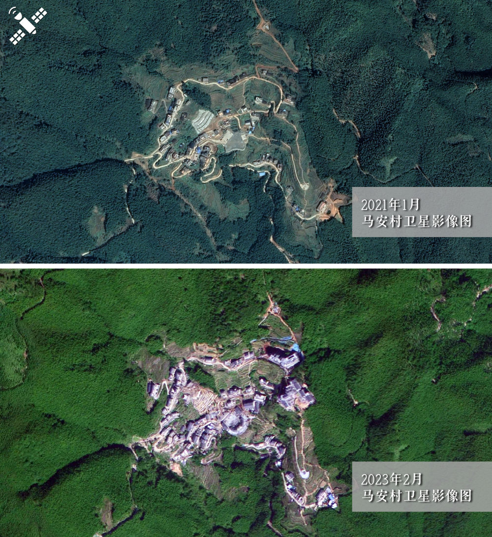 解讀:2021年1月村落原貌(上圖)對(duì)比2023年2月新貌(下圖),馬安村文旅建筑群規(guī)模顯現(xiàn)。