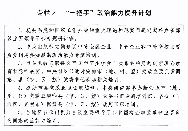 。ǘ┩怀觥瓣P(guān)鍵少數(shù)”政治訓(xùn)練。堅(jiān)持把政治訓(xùn)練貫穿干部成長(zhǎng)全周期,使干部的政治素養(yǎng)、政治能力與擔(dān)負(fù)的領(lǐng)導(dǎo)職責(zé)相匹配。強(qiáng)化“一把手”政治培訓(xùn),有計(jì)劃地選調(diào)地方、部門、國(guó)有企事業(yè)單位主要負(fù)責(zé)同志到黨校(行政學(xué)院)、干部學(xué)院參加專題培訓(xùn)。實(shí)施“一把手”政治能力提升計(jì)劃(專欄2)。省(自治區(qū)、直轄市)、市(地、州、盟)、縣(市、區(qū)、旗)黨政領(lǐng)導(dǎo)班子成員每2至3年到黨校(行政學(xué)院)、干部學(xué)院至少接受1次系統(tǒng)的黨的創(chuàng)新理論教育和黨性教育,5年內(nèi)累計(jì)不少于2個(gè)月。圍繞提高政治能力和領(lǐng)導(dǎo)能力,加強(qiáng)機(jī)關(guān)司局長(zhǎng)、處長(zhǎng)任職培訓(xùn)。重視對(duì)女干部、少數(shù)民族干部、黨外干部等的政治培訓(xùn)。加強(qiáng)對(duì)高層次人才的政治引領(lǐng),中央組織部會(huì)同有關(guān)單位每年組織一定數(shù)量人才開展國(guó)情研修。