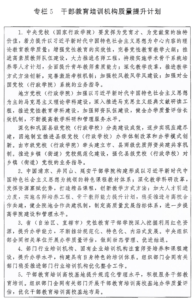 。ㄒ唬┡嘤(xùn)機(jī)構(gòu)建設(shè)。推進(jìn)各級(jí)黨校(行政學(xué)院)建設(shè),以教學(xué)督導(dǎo)、師資培養(yǎng)、質(zhì)量評(píng)估為重點(diǎn),強(qiáng)化上級(jí)黨校(行政學(xué)院)對(duì)下級(jí)黨校(行政學(xué)院)的業(yè)務(wù)指導(dǎo),不斷提高辦學(xué)水平。推進(jìn)縣級(jí)黨校(行政學(xué)校)分類建設(shè)。加強(qiáng)社會(huì)主義學(xué)院建設(shè)。進(jìn)一步提升部門行業(yè)培訓(xùn)機(jī)構(gòu)、國(guó)有企業(yè)培訓(xùn)機(jī)構(gòu)辦學(xué)質(zhì)量。加強(qiáng)對(duì)干部教育培訓(xùn)高;亍⒒鶎痈刹拷逃嘤(xùn)機(jī)構(gòu)辦學(xué)指導(dǎo)。開展黨校(行政學(xué)院)、。ㄗ灾螀^(qū)、直轄市)黨性教育干部學(xué)院、干部教育培訓(xùn)高;剞k學(xué)質(zhì)量評(píng)估。加強(qiáng)各類黨員干部教育培訓(xùn)機(jī)構(gòu)規(guī)范管理,嚴(yán)控新設(shè)以黨員干部為培訓(xùn)對(duì)象的培訓(xùn)機(jī)構(gòu)。支持地方、部門聯(lián)合開展培訓(xùn),鼓勵(lì)干部教育培訓(xùn)機(jī)構(gòu)開展區(qū)域協(xié)作交流,推動(dòng)優(yōu)質(zhì)培訓(xùn)資源共享。實(shí)施干部教育培訓(xùn)機(jī)構(gòu)質(zhì)量提升計(jì)劃(專欄5)。