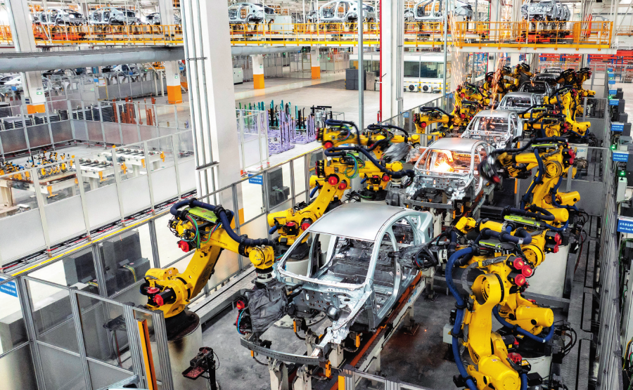 在位于湖南省長沙市的比亞迪長沙雨花工廠,機(jī)械臂進(jìn)行車身焊接作業(yè)(2024年3月21日攝)。 陳思汗攝/本刊