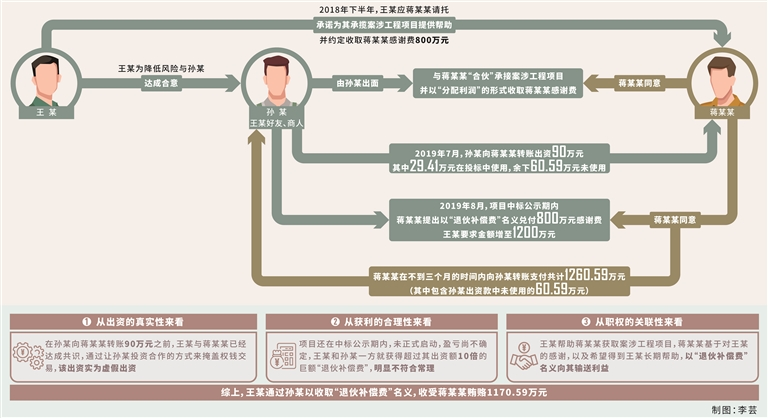 萬玉博:在案件查辦過程中,審查調(diào)查人員發(fā)現(xiàn),王某為了掩蓋其與蔣某某的權(quán)錢交易,采取讓其朋友、商人孫某與蔣某某合伙承接案涉工程項目的方式,企圖將感謝費披上民事行為的合法外衣。經(jīng)梳理,王某收受蔣某某感謝費主要實施了以下步驟: