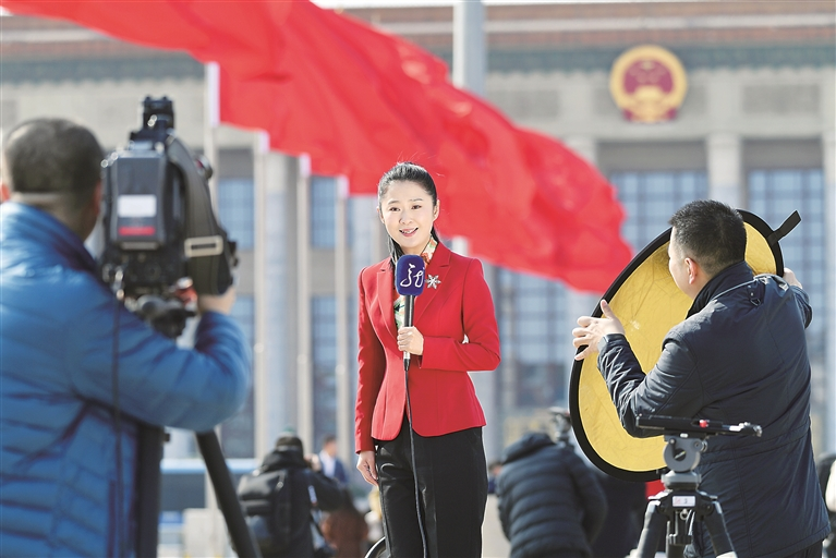 堅持團結(jié)穩(wěn)定鼓勁、正面宣傳為主,才能唱響主旋律,傳播正能量,不斷鞏固和壯大主流思想輿論,弘揚社會主義核心價值觀,為培育積極理性社會心態(tài)、促進(jìn)社會和諧穩(wěn)定提供精神養(yǎng)料。圖為今年全國兩會期間,媒體記者在人民大會堂外進(jìn)行報道。圖片來源:視覺中國