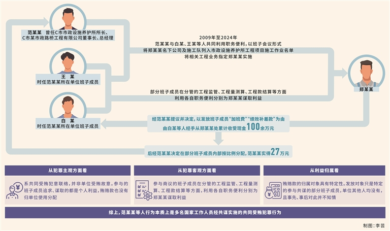 2009年至2024年,范某某與單位時(shí)任部分班子成員白某、王某等人共同利用職務(wù)便利,以班子會(huì)議形式,將鄭某某名下公司及施工隊(duì)列入市政設(shè)施養(yǎng)護(hù)所工程項(xiàng)目施工作業(yè)名單,將相關(guān)工程業(yè)務(wù)指定鄭某某實(shí)施,部分班子成員在分管的工程監(jiān)管、工程量測(cè)算、工程款結(jié)算等方面,利用各自職務(wù)便利分別為鄭某某謀取利益。2009年至2024年,經(jīng)范某某提議并決定,以發(fā)放班子成員“加班費(fèi)”“績效補(bǔ)差款”為由,由班子成員白某等人經(jīng)手,從鄭某某處累計(jì)收受現(xiàn)金100余萬元,后經(jīng)范某某決定在部分班子成員內(nèi)部按比例分配,范某某實(shí)得27萬元。