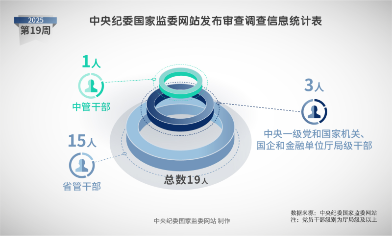 2025年第19周,中央紀(jì)委國家監(jiān)委網(wǎng)站共發(fā)布19條審查調(diào)查信息。其中,中管干部1人,中央一級黨和國家機(jī)關(guān)、國企和金融單位廳局級干部3人,省管干部15人。