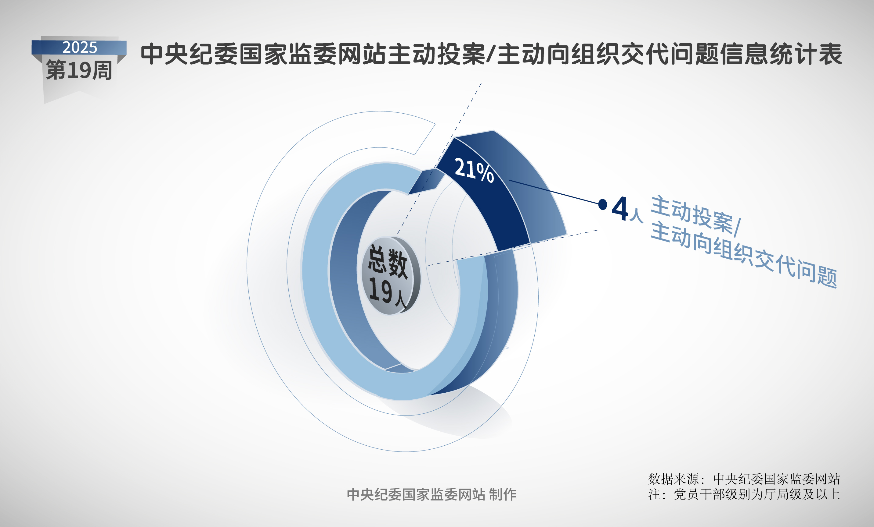 2025年第19周,中央紀(jì)委國家監(jiān)委網(wǎng)站發(fā)布的審查調(diào)查信息中,3名黨員領(lǐng)導(dǎo)干部主動(dòng)投案,1名黨員干部主動(dòng)向組織交代問題。